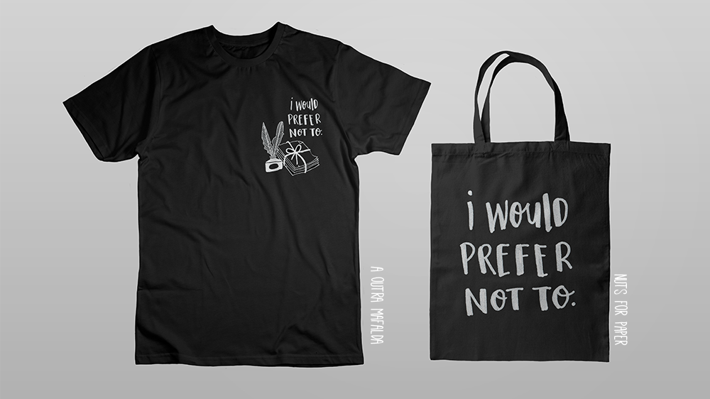 Optei pela versão que aludia ao escrivão - com papel e a caneta de aparo, juntamente com a frase. No entanto continuava a achar que apenas a frase era uma mensagem mais universal e que poderia apelar a mais pessoas do que apenas aquelas que conhecem o livro.5