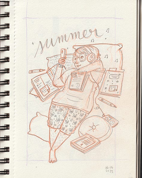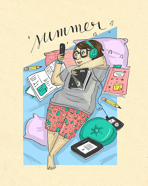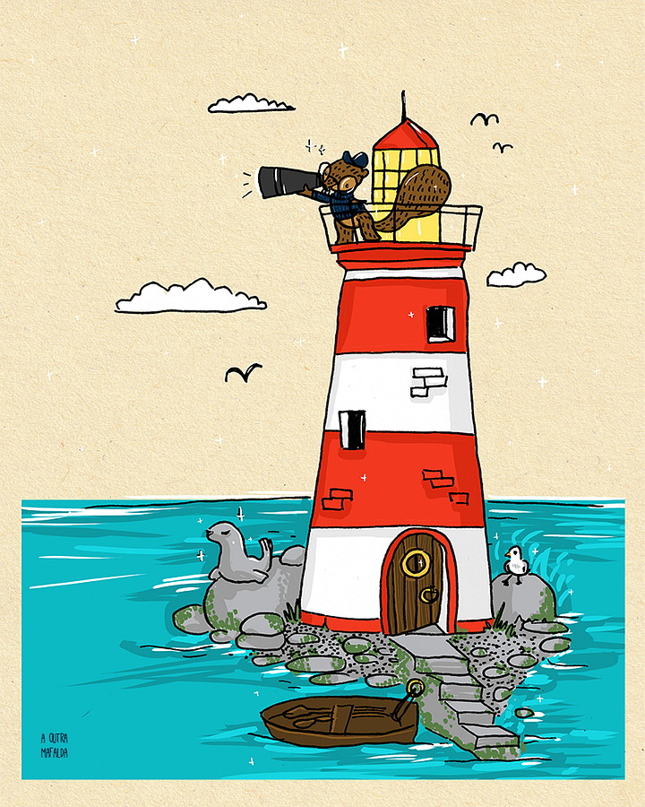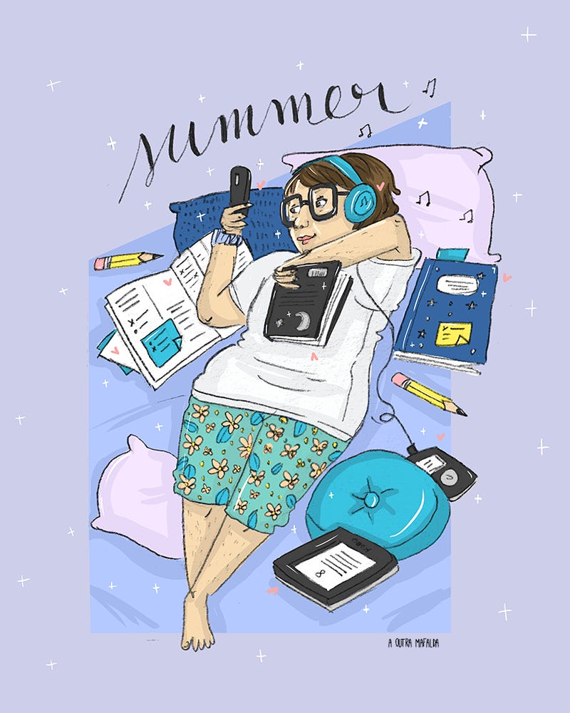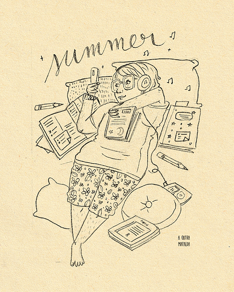 A ilustração deste mês é uma carta de amor ao Verão, especialmente para quem não gosta muito do calor e do sol que queima, mas que por outro lado prefere a sombra, o fresco, e aproveita este tempo para alimentar a imaginação e novas ideias.